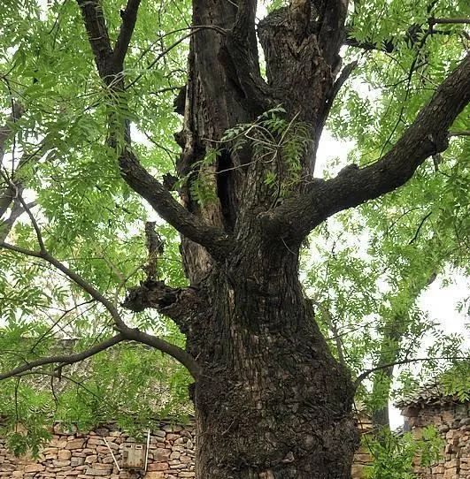 村口有棵老樹,不是很高,樹干卻很粗壯,兩三個人牽著手才能擁他入懷。小時候總會在大樹里躲貓貓,因為樹干上有一個樹洞,沒地方躲藏時總會躲到里面。后來聽年紀大的老者說,樹洞是抗日時期留下的,具體情況不太清楚,但總是有人在大樹上拴上紅布條,有保佑之意。