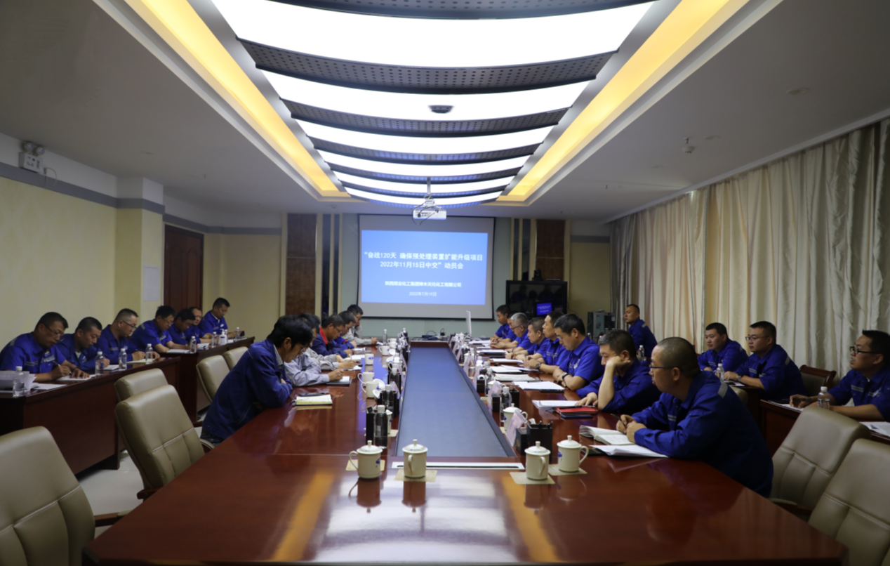 7月19日,神木煤化工天元公司召開“奮戰120天 確保2022年11月15日預處理裝置擴能升級項目中交”動員會,天元公司領導、各參建單位人員、項目組成員及相關車間、部辦人員參加了會議。