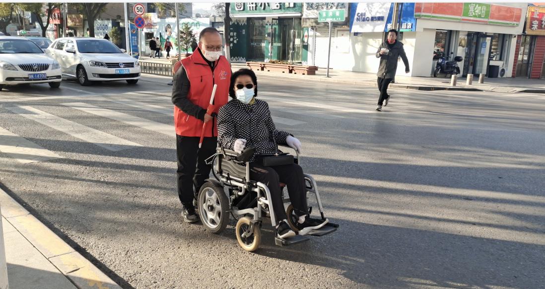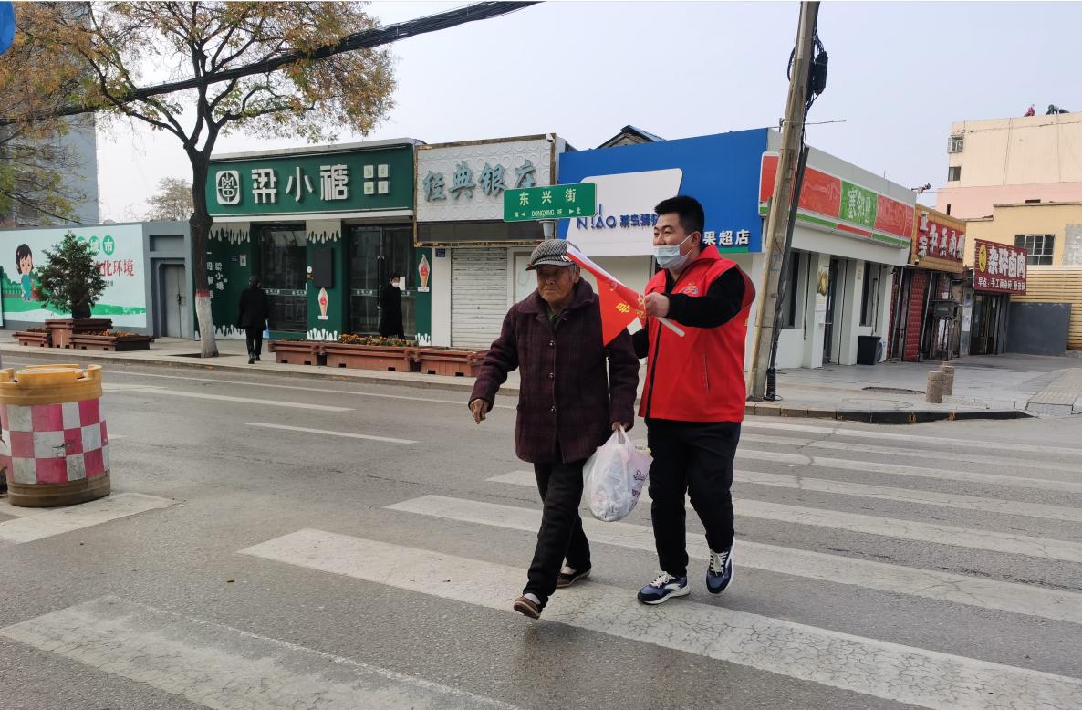 “大爺,現在是紅燈,您等會兒,我扶您過去?!薄袄夏棠蹋F在有很多車,等會我推著您走人行道?!薄爸x謝你,小伙子!”正值下班放學高峰期,神木市東興街古城北路十字路口車輛行人川流不息,在斑馬線兩側值守的志愿者們早已投入了志愿服務活動中。