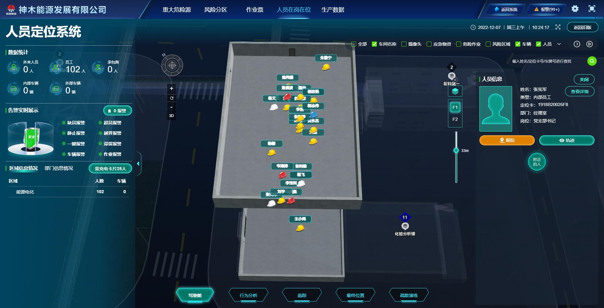 127日,神木煤化工能源公司人員在崗在位管理系統(tǒng)正式投入使用。該系統(tǒng)主要包括區(qū)域人數(shù)車輛統(tǒng)計(jì)、人員實(shí)時(shí)定位、人員歷史軌跡回放、缺員報(bào)警、超員報(bào)警、靜止報(bào)警、越界報(bào)警、一鍵報(bào)警、滯留報(bào)警、車輛報(bào)警、作業(yè)報(bào)警、低電報(bào)警、數(shù)據(jù)可視化展示、數(shù)據(jù)接口等功能。