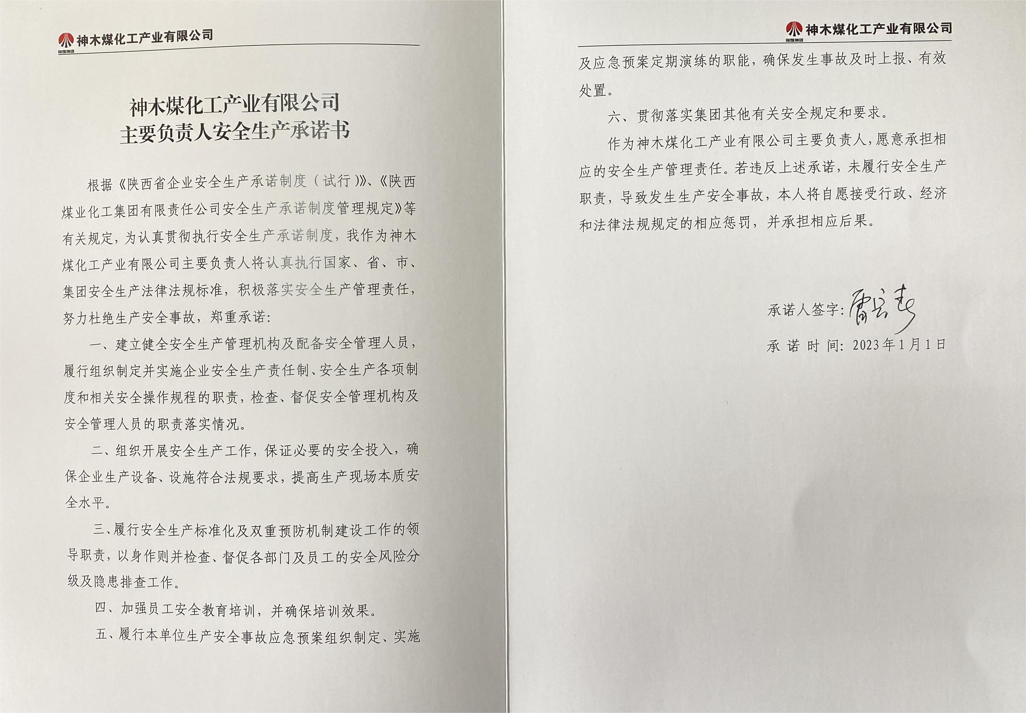 神木煤化工產(chǎn)業(yè)有限公司2023年度主要負(fù)責(zé)人安全生產(chǎn)承諾書公示