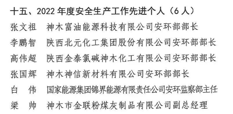 近日,神木煤化工富油公司榮獲神木高新技術產業開發管理委員會2022年度安全生產工作先進企業、科技創新先進企業等榮譽稱號;該公司副總工程師、安全環保部部長張文祖榮獲2022年度安全生產先進個人,王鳳婭榮獲2022年度統計工作先進個人。