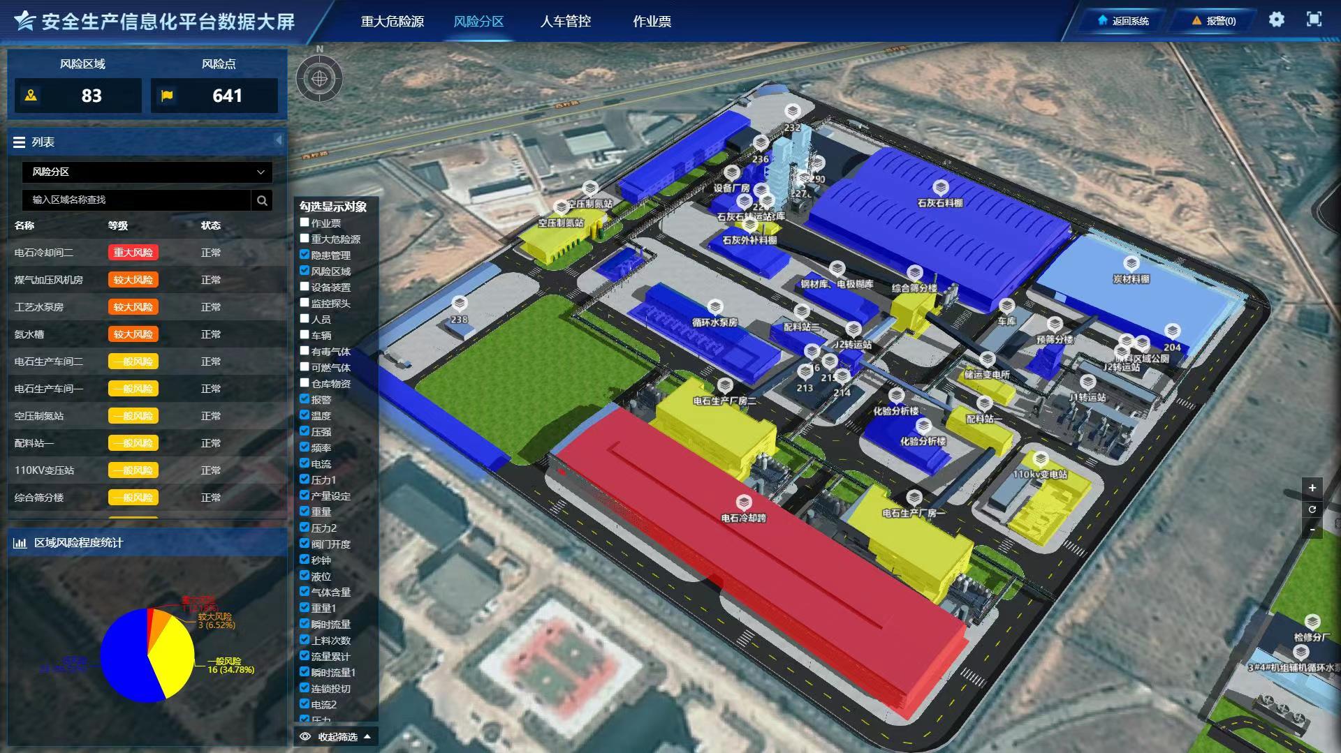 為進一步提升安全管理水平,該公司建立了一套適用于自身安全生產管理為一體的雙重預防機制數字化平臺。結合高精度定位技術與3D建模、數字孿生、數據分析等技術集成,建設了重大危險源監測預警系統(合并有毒可燃氣體監測預警)、風險隱患雙重預防管理系統、安全生產全流程系統以及人員在崗在位管理系統,實現了多種業務的信息化管理。可通過鳥瞰、“3D”視圖、局部特寫等形式,對生產線、工藝流程、生產設備進行可視化管控,大幅提升了工廠生產效率和質量管理,降低了運營成本。