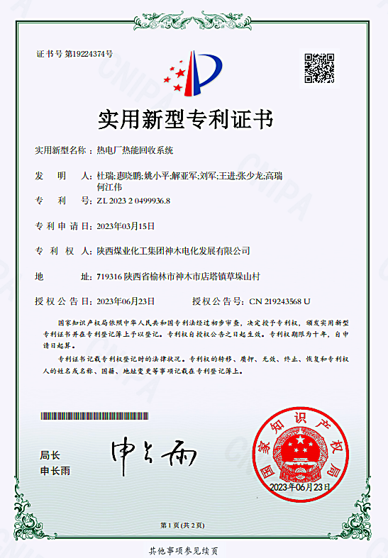 近日,神木煤化工電化公司“熱電廠熱能回收系統(tǒng)”榮獲實(shí)用新型專利授權(quán)。