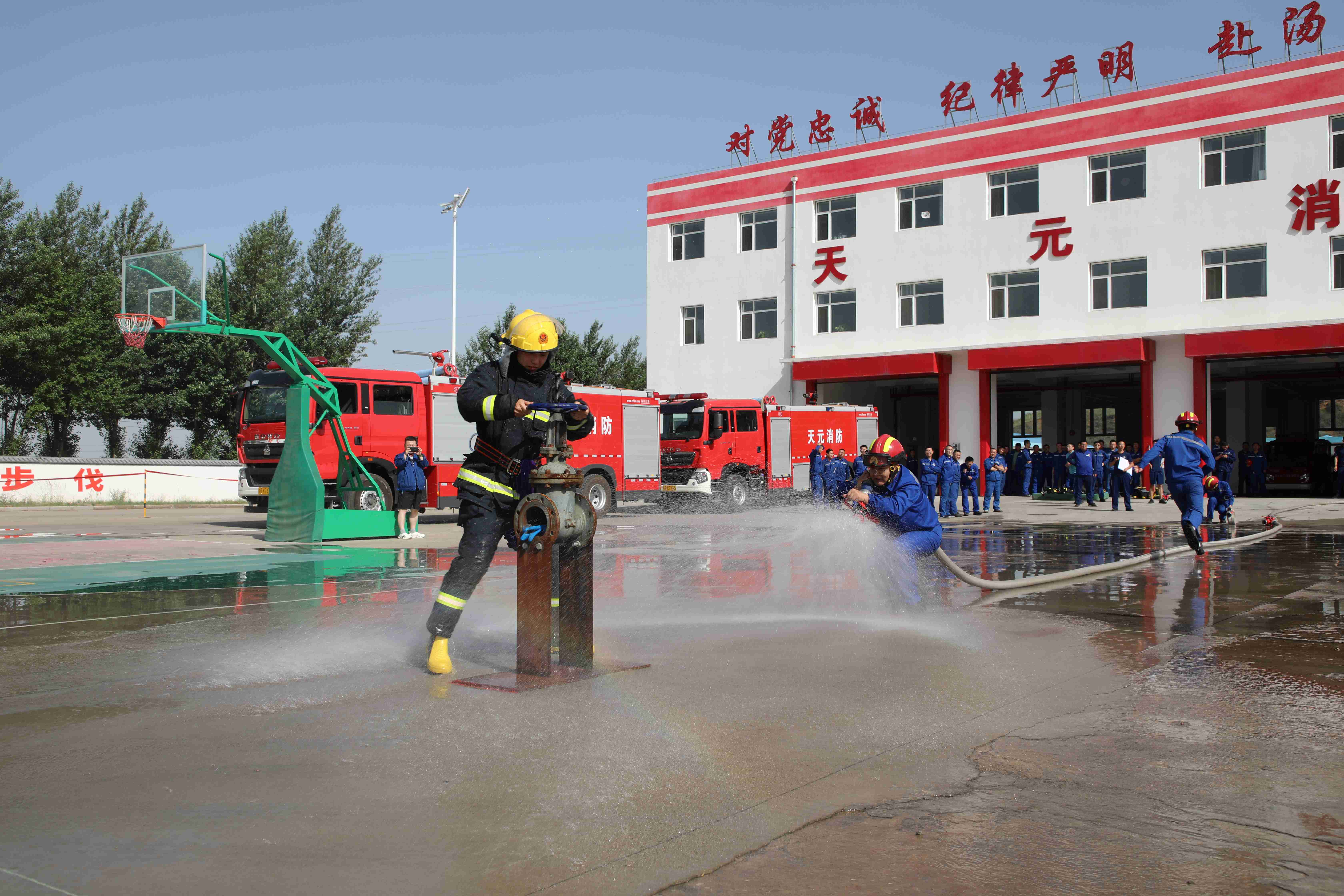 隨著比賽“開始”口令的下達,參賽選手們動作迅速、配合默契,各參賽隊伍3號隊員攜帶堵漏器材并持分水器跑至放置線,4號隊員將2盤80mm水帶連接在消火栓出水口和分水器上,并操作分水器。1號隊員攜帶1盤65mm水帶和1把水槍跑至分水器放置線,原地鋪設水帶并連接分水器直接出水,推進掩護3號隊員至掩護線后。3號隊員完成關閥任務后,1號隊員繼續利用噴霧水槍對關閥區進行冷卻,直至滅火任務完成后停水……整個過程一氣呵成,各參賽隊伍充分展現了過硬的消防應急技能及勇爭第一、奮力拼搏的精神面貌。最終,經過激烈角逐,焦化車間獲得第一名,預處理車間獲得第二名,加氫車間獲得第三名。