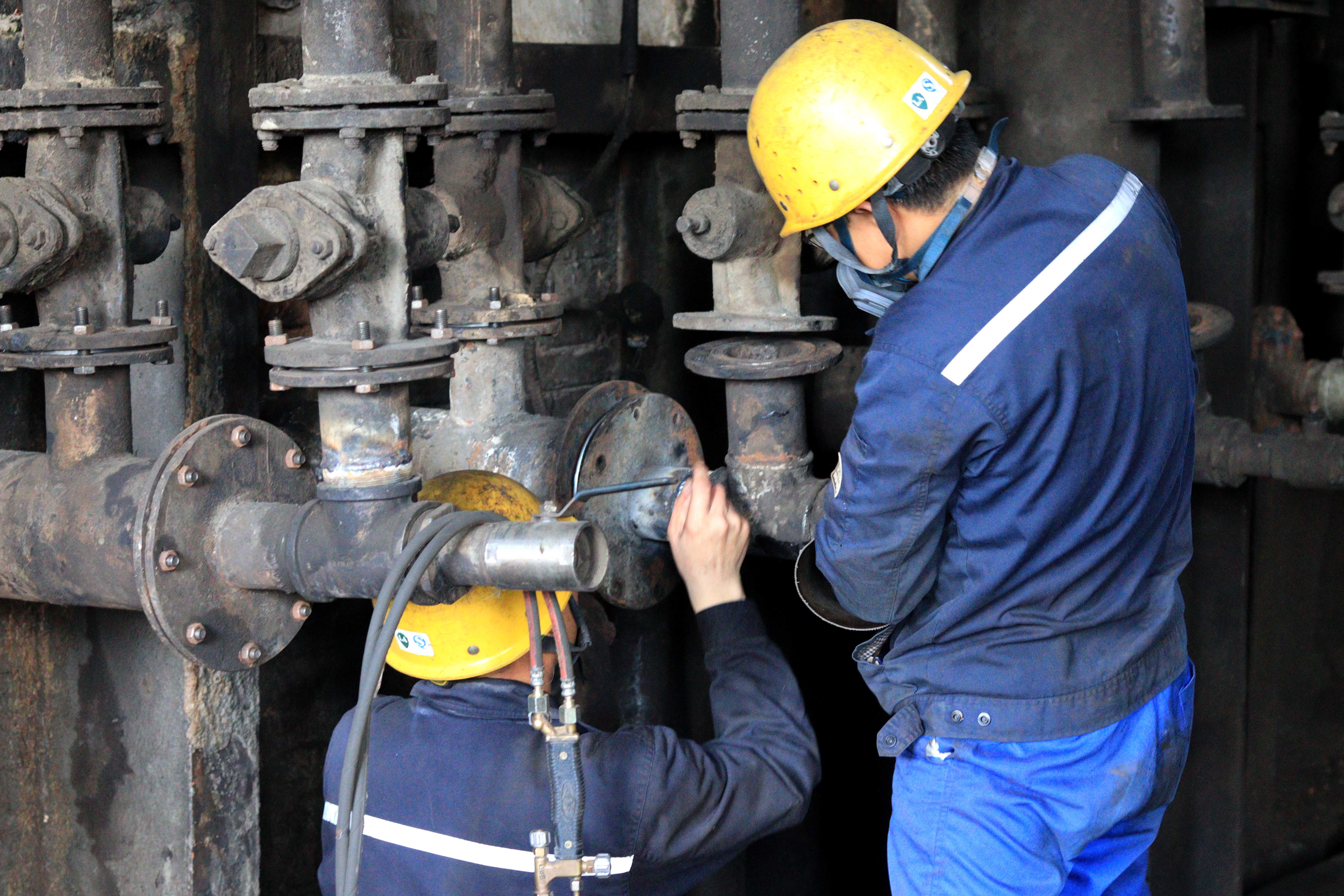炭化爐前,焦化車間的兩組員工正熱火朝天地忙碌著:一組時而掄著大錘,時而利用吊鏈將需要維修更換的燒嘴拉出,另一組將維修好或者新的燒嘴進行焊接。在此次檢修工作中,他們每個人發揮著自己的專長,各司其職卻又能完美配合,完成一個又一個地更換工作。(白 露)