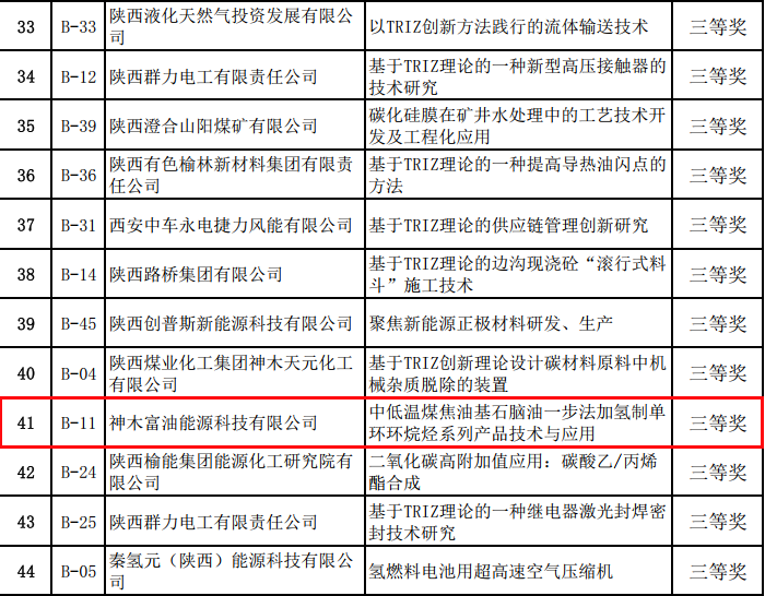 11月上旬,神木煤化工富油公司“基于 TRIZ 創新方法-中低溫煤焦油基石腦油一步法加氫制單環環烷烴系列產品技術與應用”創新成果在“秦創原?涇河新城杯”2023年陜西省創新方法大賽中榮獲三等獎。