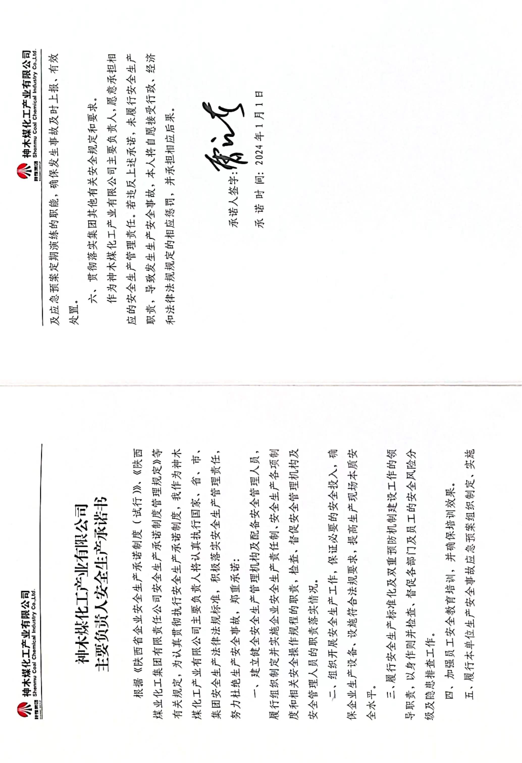 神木煤化工產(chǎn)業(yè)有限公司2024年度主要負責(zé)人安全生產(chǎn)承諾書