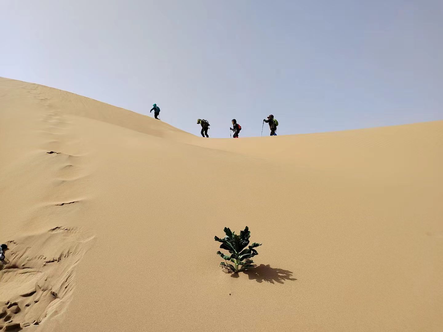 沙漠里的兩種小生命給我留下了極其深刻的印象。一種是通體純黑的小甲蟲,在太陽下閃閃發光,爬行的速度很快,爬過的地方留下兩道淺淺的印子,但是很快又被沙子所掩蓋。總看到他們或形單影只,或者兩兩結隊,在向陽的山坡上往上爬,偶爾也一動不動地躺趴在那里曬太陽。還有一種植物,長在向陽的沙坡底部,看起來有點像土豆,跟常見的沙漠植物不同,它有著飽滿的莖干和舒展的葉子。同伴從沙坡上往下滾,完全從它身上壓過去,我想著那植物肯定會被壓趴下,但很快,它又倔強地立起來了。我很好奇在這樣多風又滿是沙子的環境中它們是怎么生存下來的?或許經過幾千年的進化篩選,他們早就形成一套自己的生存法寶,成了這片沙漠真正的主人。