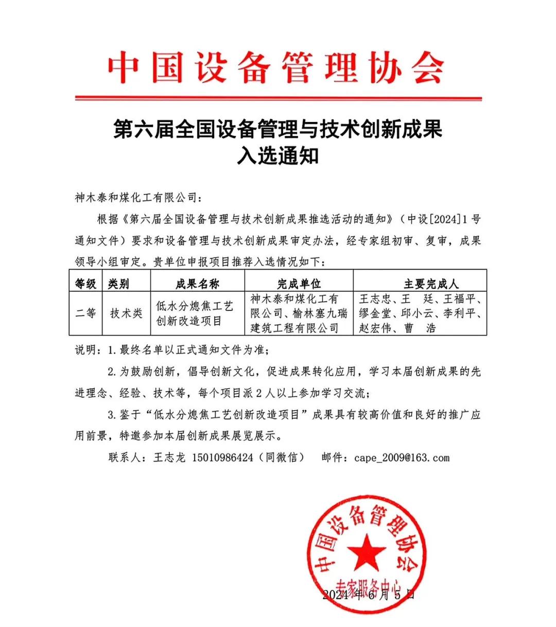 近日,從中國設備管理協會相關文件獲悉,神木煤化工泰和公司“低水分熄焦工藝創新改造項目”獲第六屆全國設備管理與技術創新成果二等獎。