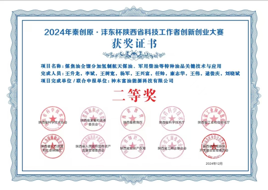 近日,神木煤化工富油公司創新成果《煤焦油全餾分加氫制航天煤油、軍用柴油等特種油品關鍵技術與應用》在2024年陜西省科技工作者創新創業大賽中斬獲二等獎。