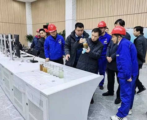 在富油公司二期集控室內,呈現出一片嶄新景象,操作人員認真分析、記錄著運行數據。毛世強對富油公司二期項目的部分產品樣品逐一查看,詳細了解工藝指標及銷售情況,并對二期項目試車進展情況、人員配備、存在的問題及下一步工作安排進行詢問。他指出,富油公司要積極推進二期項目—環烷基油加氫裝置尾項施工等系列工作,推動重點項目實現新突破。