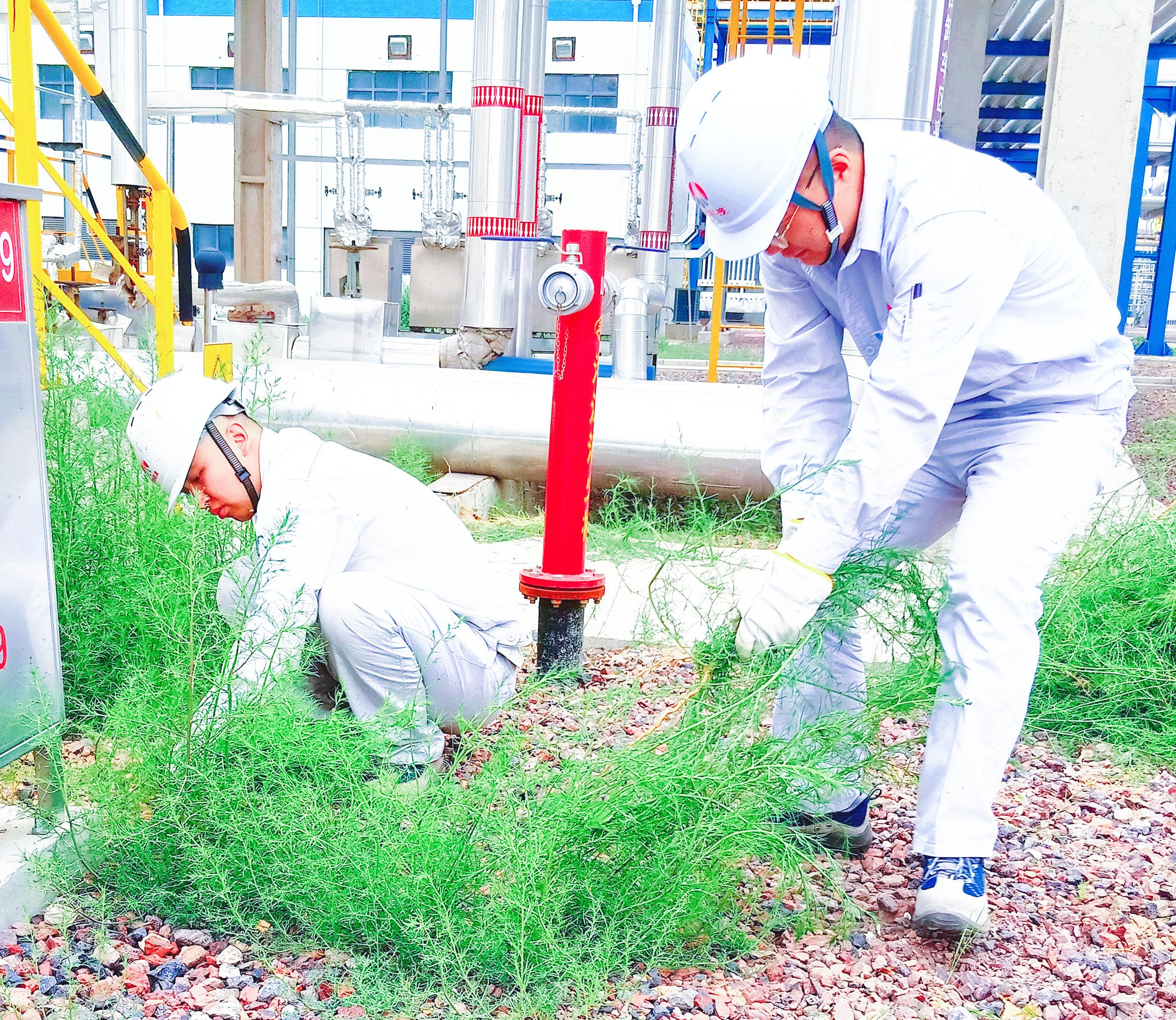 一線員工在烈日下進行義務(wù)勞動,他們將整個區(qū)域的雜草、枯枝清理干凈,消除火災隱患