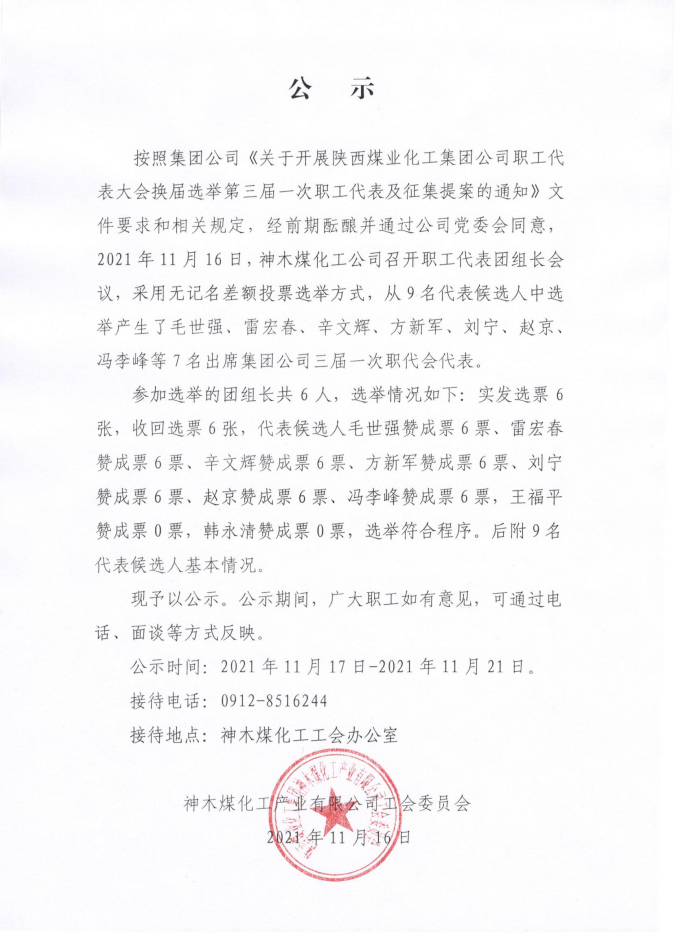 神木煤化工公司出席集團公司三屆一次職代會代表公示