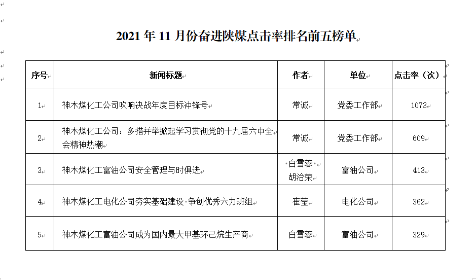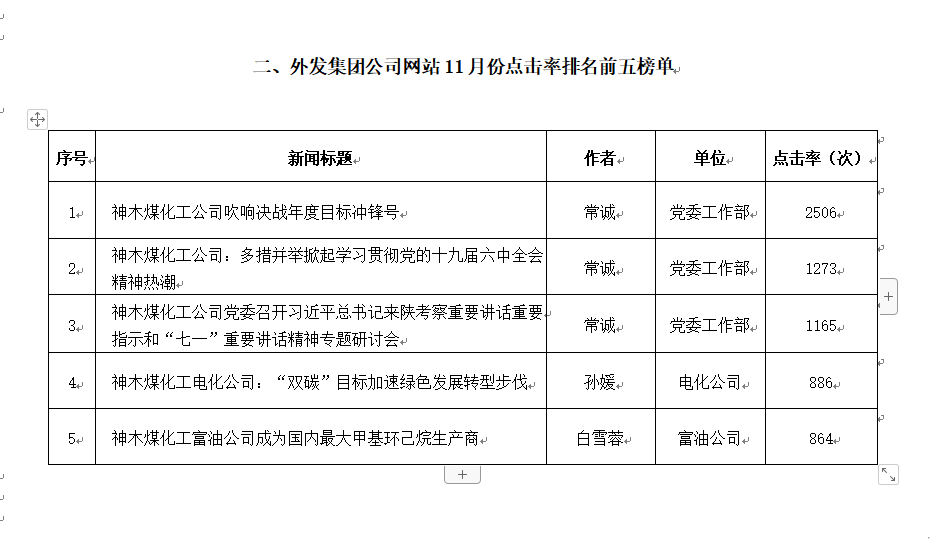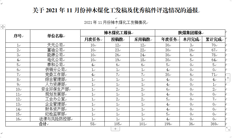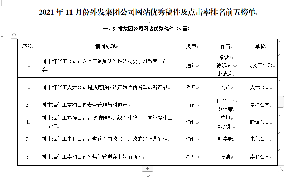 關于2021年11月份神木煤化工公司發(fā)稿及優(yōu)秀稿件評選情況的通報
