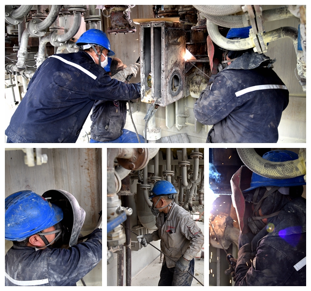 下午2:00,現(xiàn)場搶修工作全面鋪開,泰和公司副總經(jīng)理王廷及各管理人員現(xiàn)場指揮,對搶修工作進(jìn)行現(xiàn)場指導(dǎo),確保施工安全、進(jìn)度有序推進(jìn)。各搶修人員堅持各自既定工作崗位,工作有條不紊,兩個焊工蹲在狹小的工作空間,不顧爐體高溫的灼熱,不時變換著姿勢,一絲不茍的進(jìn)行焊接。其他人員也不示弱,都積極的干好自己的工作。
