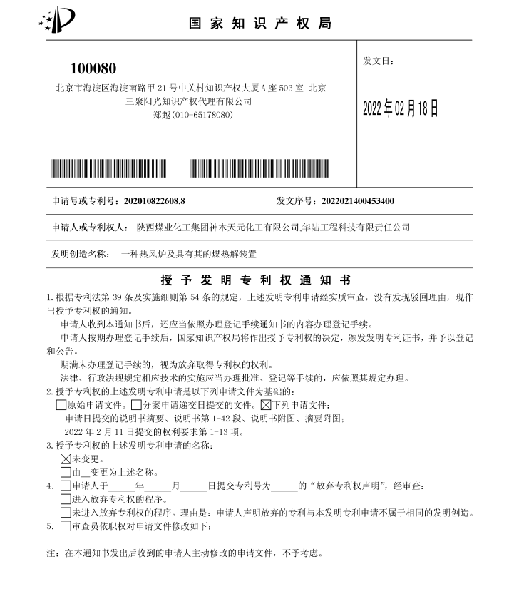 近日,神木煤化工天元公司申請的“一種熱風爐及具有其的煤熱解裝置”發明專利獲得國家知識產權局授權。